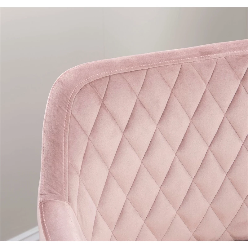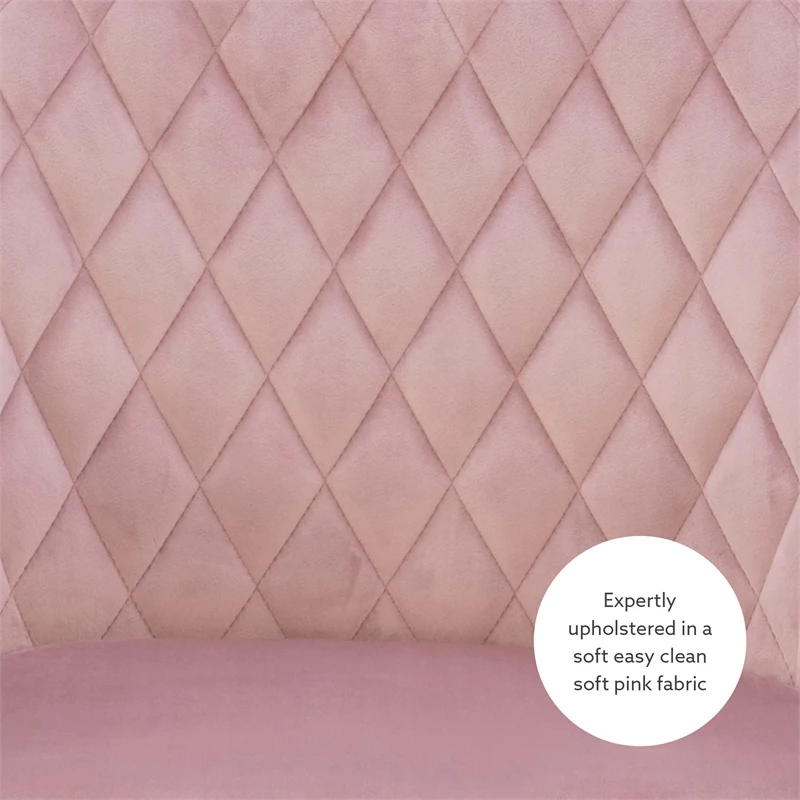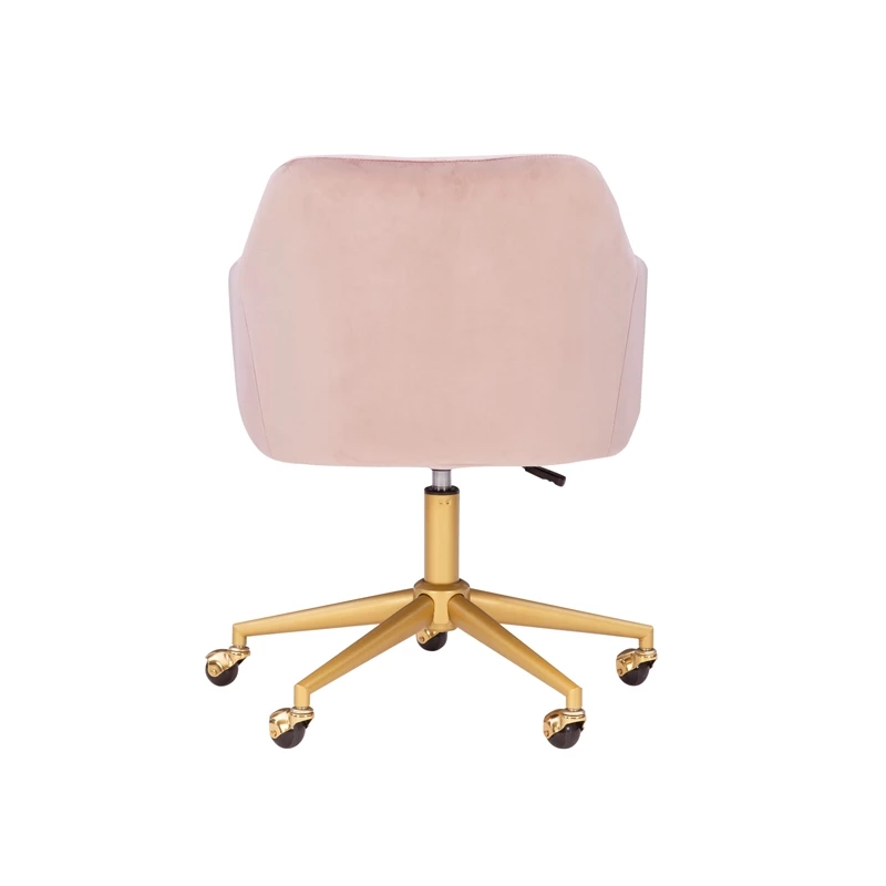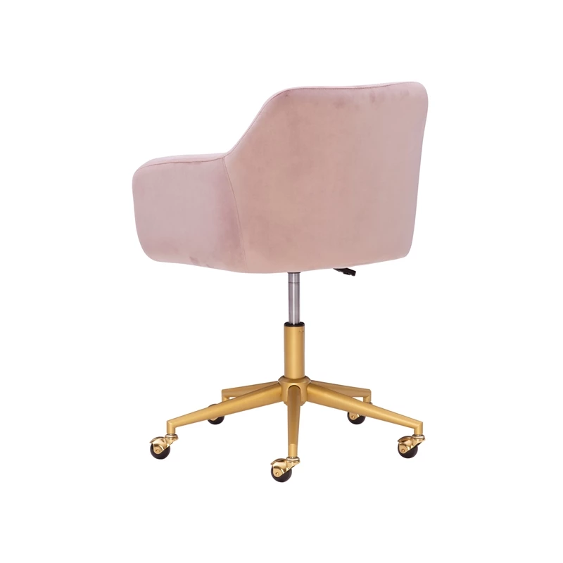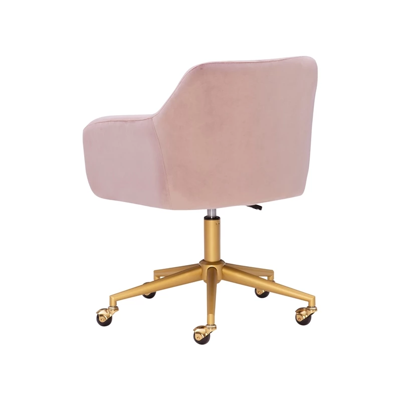 Elegant contemporary styling brings a tailored look to any home office. Comfortable padded seating in a low profile with contoured arms. Expertly upholstered in a soft easy clean soft pink fabric featuring a quilted pattern on the seat back. Completed with a gold powder coated base and rolling casters that allow for easy movement around your workspace. The adjustable-height seat allows the chair to work with a variety of table heights. Tilt mechanism allows you to lean back or it locks if preferred. Perfect for your home office, makeup vanity or for casual dining. Tilt, adjusting height and base mechanisms meets commercial grade standards for use and durability.