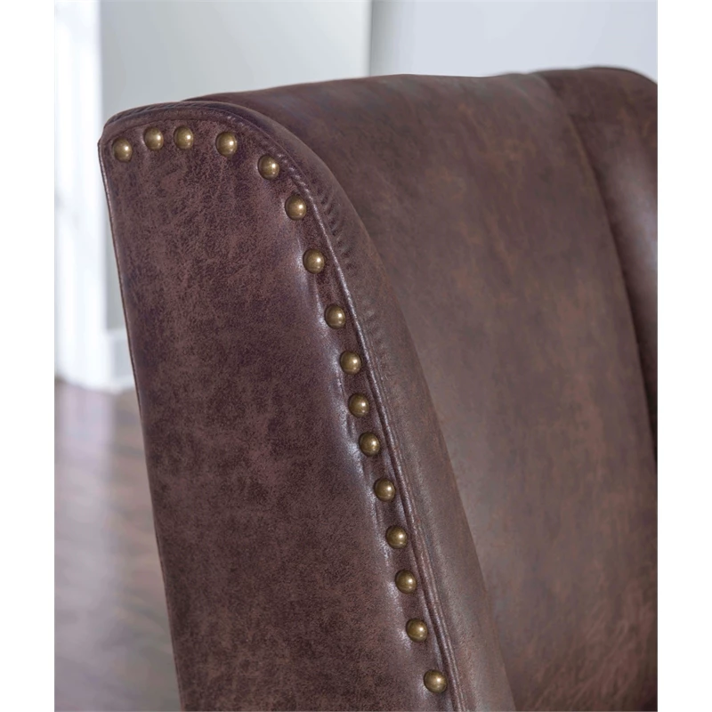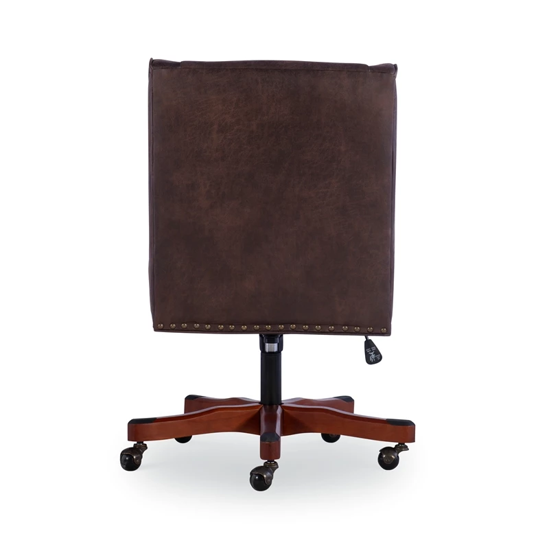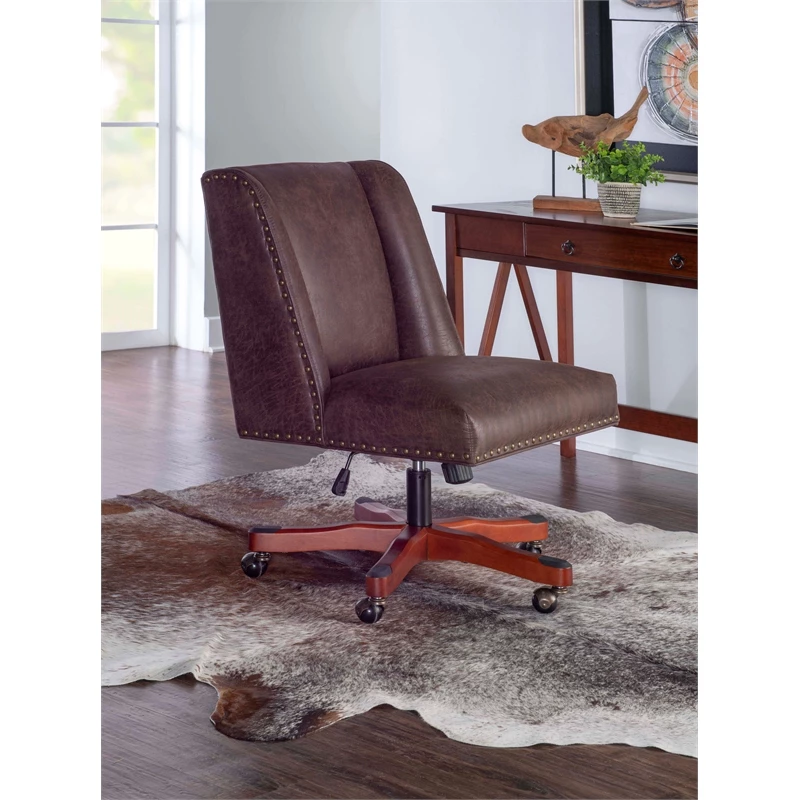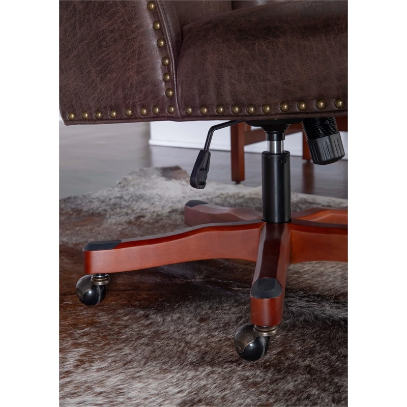 Add style and function to your office with the UrbanPro Office Chair. The soft, plush frame features simple modern lines upholstered in brown faux leather and accented with burnished brass nailheads. A sturdy dark walnut wood base is set upon durable metal casters for easy maneuverability. An adjustable seat height ensures this chair works for a variety of table heights. Perfect for a home workspace or an added touch of style at the office.