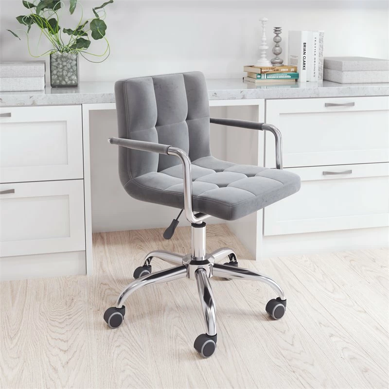 With it’s modernist 60’s vibe, the Kerry Office is smartly constructed with a steel frame, chrome plated steel arms, chrome plated steel base, and a polyester velvet covered seat and armrests. This chair is height adjustable. It works in any space, home office, bedroom, teen or kids room.